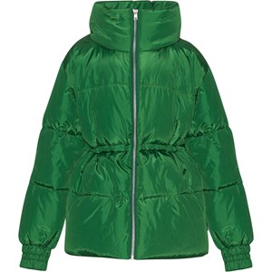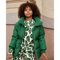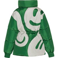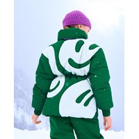 Grüne, wasserabweisende Jacke mit Reißverschluss entlang der Vorderseite, Taschen an den Seiten, elastischen Ärmelausschnitten, hohem Kragen mit versteckter, abnehmbarer Kapuze und Taillengummi, um die Silhouette und Passform der Jacke anzupassen. Auf der Rückseite der Jacke befindet sich ein weißer Smiley-Print mit Nähten um alle Figuren, was eine schöne Steppungswirkung ergibt. Es wurde eine wasser- und schmutzabweisende Beschichtung verwendet, ohne den Einsatz von Chemikalien wie PFOS, PFOA und Ähnlichem.