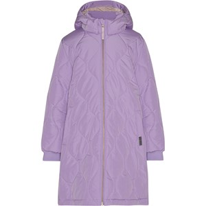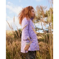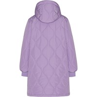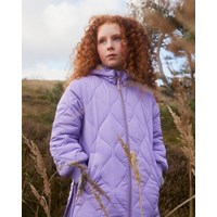 Weicher gesteppter Daunenmantel in Lila mit Reißverschluss entlang der Vorderseite, abnehmbarer Kapuze, Reißverschlusstaschen auf beiden Seiten und breitem elastischem Rippstrick an den Ärmelausschnitten. Er ist mit einer synthetischen Daunenfüllung namens Pearl Padding gefüttert, die gleichmäßige Weichheit bietet, die Wärme gut hält und das Waschen erleichtert. Es wurde eine wasser- und schmutzabweisende Beschichtung verwendet, ohne den Einsatz von Chemikalien wie PFOS, PFOA und Ähnlichem.