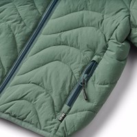 Grüne wasserabweisende Steppjacke aus recyceltem Nylon. Die Jacke hat eine abnehmbare Kapuze, einen Stehkragen, einen Reißverschluss mit Kinnschutz und Reißverschlusstaschen vorne.