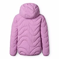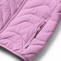 Rosa wasserabweisende Daunenjacke aus recyceltem Nylon. Die Jacke hat eine abnehmbare Kapuze, einen Stehkragen, einen Reißverschluss mit Kinnschutz und Reißverschlusstaschen vorne.