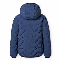 Blauer wasserabweisender Daunenmantel aus recyceltem Nylon. Der Mantel hat eine abnehmbare Kapuze, einen Stehkragen, einen Reißverschluss mit Kinnschutz und Reißverschlusstaschen vorne.