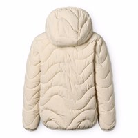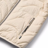 Off-White wasserabweisende Daunenjacke aus recyceltem Nylon. Die Jacke hat eine abnehmbare Kapuze, einen Stehkragen, einen Reißverschluss mit Kinnschutz und Reißverschlusstaschen vorne.