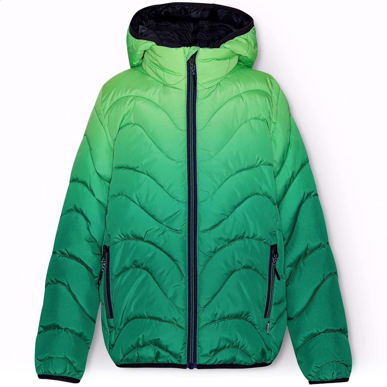 Wasserabweisende Pufferjacke in grünem Farbverlauf, beginnend mit einem hellgrünen Farbton an der Kapuze und allmählich tiefer und dunkler werdend bis zum unteren Teil. Die Jacke verfügt über eine abnehmbare Kapuze, einen Stehkragen, einen Reißverschluss mit Kinnschutz und Reißverschlusstaschen auf der Vorderseite. acke und Wattierung bestehen aus recyceltem Polyester. Die wasserabweisende Oberfläche ist frei von PFOS und PFOA.