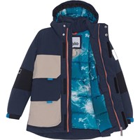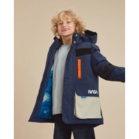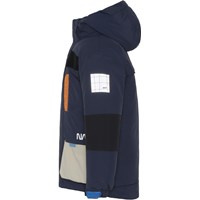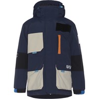 Harding ist eine blaue Jacke mit großen hellen Taschen auf der Vorderseite, Kapuze, Reflektoren und einem schönen Innenfutter mit einem Aufdruck des Universums. Die Jacke hat einen Reißverschluss vorne mit Überhang, Taschen an der Seite und einen Windschutz am Armloch und am Saum. Die Jacke ist mit technischen Daunen gefüttert, die als pearl padding bezeichnet werden und für zusätzliche Weichheit sorgen, die Wärme gut halten und ein daunenähnliches Gefühl vermitteln. Dieses Produkt ist wasserabweisend PFC-freiImprägnierung (zB enthält kein PFOS, PFOA und dergleichen). Wassersäulendruck: 10.000 mm. Atmungsaktivität: 8.000 g/m2/24 Std.