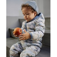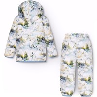 Wasserabweisendes, weiches und helles Thermoset für die Kleinsten, mit hellblauem Futter und Einfassband. Die Jacke hat eine abnehmbare Kapuze, einen Stehkragen, einen Reißverschluss mit Kinnschutz und eine einzelne Tasche auf der Vorderseite. Die Hose hat einen elastischen Bund mit einem verstellbaren Innenband. Das Set hat einen Allover-Druck einer Schneelandschaft mit spielenden Eisbären. Jacke, Hose und Wattierung bestehen aus recyceltem Polyester. Die wasserabweisende Oberfläche ist frei von PFOS und PFOA.