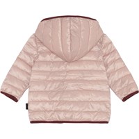 Harmony ist eine rosafarbene Babyjacke mit weinrotem Futter und Kantenband. Die Jacke hat eine abnehmbare Kapuze und ist mit Wattierung aus recycelten pearl padding gefüttert, die für zusätzliche Weichheit sorgt, die Wärme gut hält und ein daunenähnliches Gefühl vermittelt. Das Obermaterial ist wasserabweisend PFC-frei imprägniert (zB ohne PFOS, PFOA o.ä.).