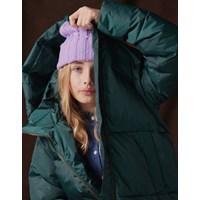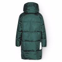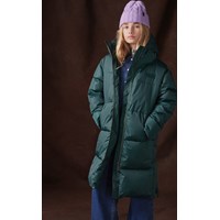 Petrolgrüne Pufferjacke aus recyceltem Polyester für einen kalten Winter. Die Jacke reicht über das Knie, hat eine abnehmbare Kapuze, Seitentaschen und Ärmel mit gerippten Bündchen, die effektiv Wind, Schnee und Regen abhalten und gleichzeitig dafür sorgen, dass die Handschuhe an ihrem Platz bleiben. Sie ist mit hohen Schlitzen an beiden Seiten ausgestattet, die mit Druckknöpfen geschlossen werden können und so für große Bewegungsfreiheit sorgen und das Radfahren in der Jacke erleichtern. Die Jacke hat einen großen Reflektor auf der Rückseite, um die Sichtbarkeit im Verkehr zu erhöhen.
