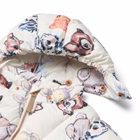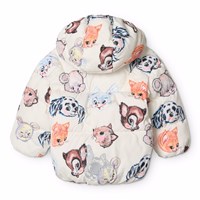 Off-White wasserabweisende Jacke für die Kleinen aus recyceltem Polyester mit einem Druck von bunten Tieren aus alten Cartoons. Die Jacke hat eine abnehmbare Kapuze, einen Frontreißverschluss, gefütterte Taschen sowie elastische Bündchen an den Handgelenken und am Saum, um die Wärme zu halten. Darüber hinaus hat die Jacke eine Füllung aus recyceltem Polyester, die eine gleichbleibende Weichheit und optimale thermische Isolierung bietet, und die wasserabweisende Oberfläche ist frei von PFOS und PFOA.