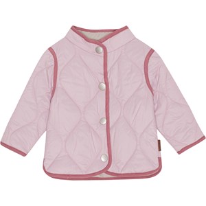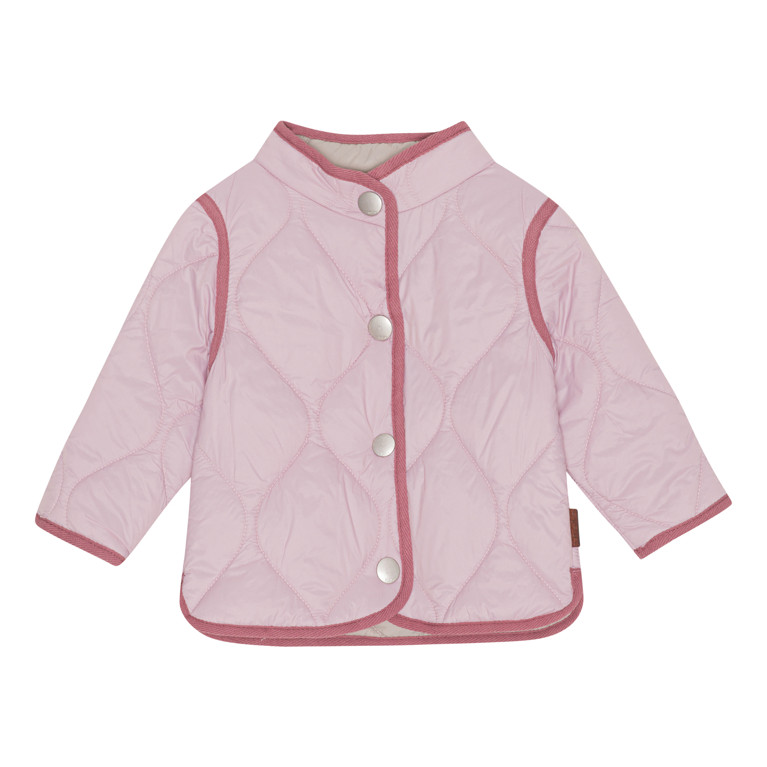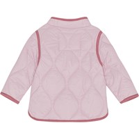 Harrie ist eine rosa gesteppte Babyjacke mit roten Kontrastkanten. Die Jacke hat einen Knopfverschluss auf der Vorderseite.
