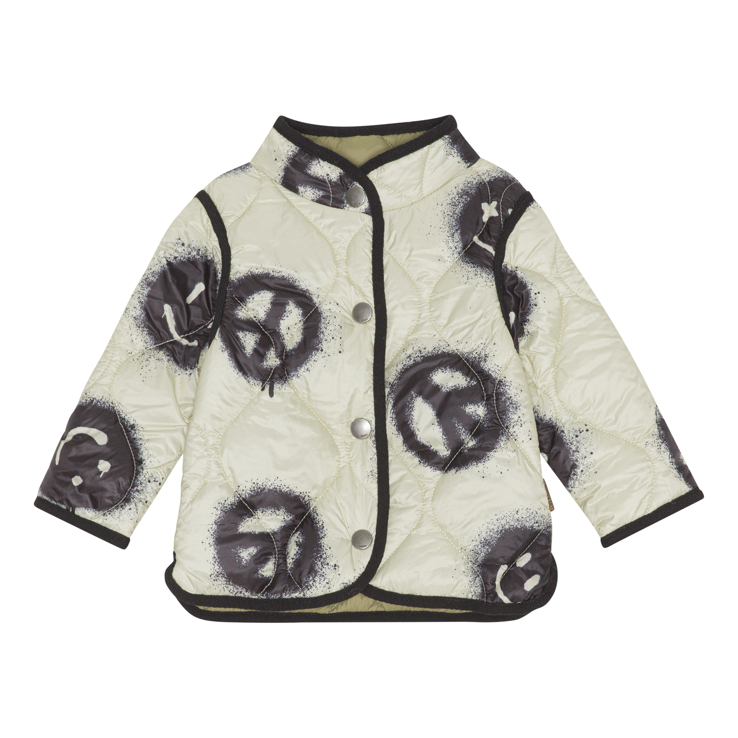 Harrie ist eine beige gesteppte Babyjacke mit schwarzen Kontrastkanten und einem Aufdruck aus Peace-Zeichen und Smileys. Die Jacke hat einen Knopfverschluss auf der Vorderseite.