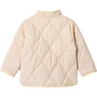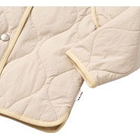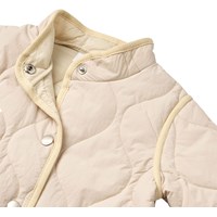 Beige, wasserabweisende Thermojacke aus recyceltem Nylon mit Steppmuster. Die Jacke hat eine normale Passform, einen Stehkragen, Druckknöpfe vorne und passende Einfassungen, die einen schönen Abschluss bieten.