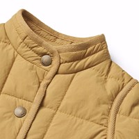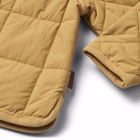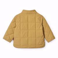 Khaki-farbene wasserabweisende Thermojacke aus recyceltem Nylon mit Steppmuster. Die Jacke hat eine reguläre Passform, Seitentaschen, Knopfverschluss auf der Vorderseite und passende Verzierungen, die für einen stilvollen Abschluss sorgen.