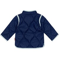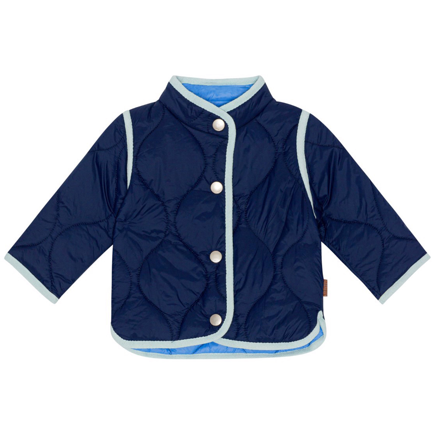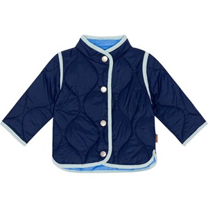 Gesteppte, dunkelblaue Jacke für kleinere Kinder mit hellblauem Saum und Knopfverschluss. Es wurde eine wasser- und schmutzabweisende Beschichtung verwendet, ohne den Einsatz von Chemikalien wie PFOS, PFOA und dergleichen.