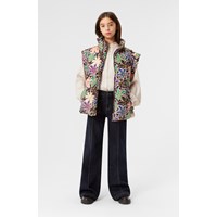 Gesteppte Weste aus recyceltem Polyester mit einem schönen mehrfarbigen Druck von Ahornblättern in verschiedenen Farben. Die Weste hat einen Stehkragen, einen Frontreißverschluss und große Armlöcher, die das Tragen einer Jacke oder eines dicken Pullovers darunter ermöglichen. Sie hat Vordertaschen und einen internen Taillengummi, der eine schöne Silhouette schafft. Die wasserabweisende Oberfläche ist frei von PFOS und PFOA.