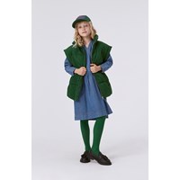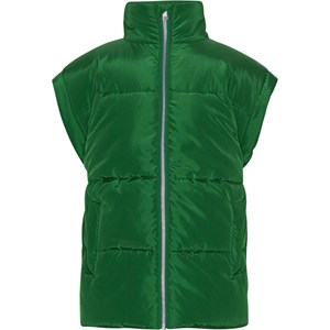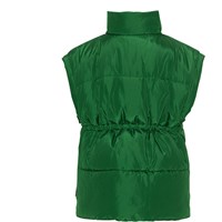 Grüne, wasserabweisende gesteppte Weste in praktischer Länge mit breiten Armausschnitten, hohem Kragen, Frontreißverschluss und Taschen auf beiden Seiten. An der Taille befindet sich ein verstellbares Gummiband, um die Silhouette und Passform anzupassen. Es wurde eine wasser- und schmutzabweisende Beschichtung verwendet, ohne den Einsatz von Chemikalien wie PFOS, PFOA und Ähnlichem.