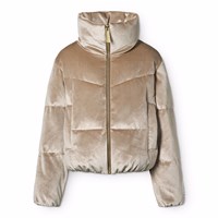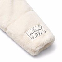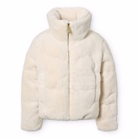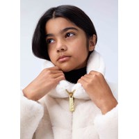 Weiße Jacke aus weichem, imitiertem Pelz aus recyceltem Polyester. Die Jacke hat einen Stehkragen, Seitentaschen und elastische Bündchen an den Handgelenken und am Saum. Die Jacke hat ein beiges Innenfutter und ist mit recyceltem Polyester gefüttert, was für gleichmäßige Weichheit und optimale Wärmeisolierung sorgt.