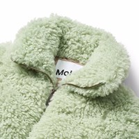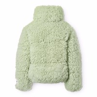 Grüne Kunstpelzjacke im Schaffell-Look aus recyceltem Polyester. Die Jacke hat einen Stehkragen, Seitentaschen und elastische Bündchen und Saum. Die Jacke hat ein beiges Innenfutter und ist mit recycelter Polyesterfüllung gefüttert, die für gleichmäßige Weichheit und optimale Wärmeisolierung sorgt.