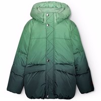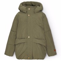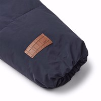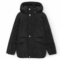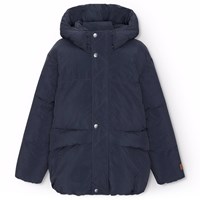 Wasserabweisende dunkelblaue Jacke aus recyceltem Nylon. Die Jacke hat eine abnehmbare Kapuze und einen Reißverschluss mit einer Klappe, die Schnee, Wind und Wasser abhält. Es gibt Taschen vorne und ein verstellbares Gummiband am Saum, das den Wind abhält und die Wärme besser speichert. Die Jacke ist mit Perlenpolster gefüttert, eine recycelte polyesterfüllung, die für gleichbleibende Weichheit, optimale Wärme und einfache Pflege beim Waschen sorgt. Die wasserabweisende Oberfläche der Jacke ist frei von PFOS und PFOA.
