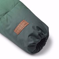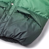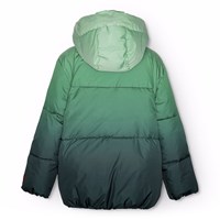 Wasserabweisende Jacke aus recyceltem polyester in grünen Farbverläufen. Die Jacke hat eine abnehmbare Kapuze und einen Reißverschluss mit einer Klappe, die Schnee, Wind und Wasser abhält. Es gibt Taschen vorne und ein verstellbares Gummiband am Saum, das den Wind abhält und die Wärme besser speichert. Die Jacke ist mit Perlenpolsterung gefüttert, eine recycelte polyesterfüllung, die für gleichbleibende Weichheit, optimale Wärme und einfache Pflege beim Waschen sorgt. Die wasserabweisende Oberfläche der Jacke ist frei von PFOS und PFOA.