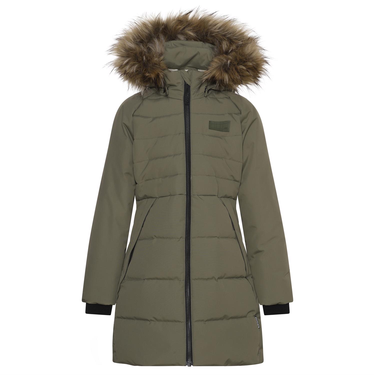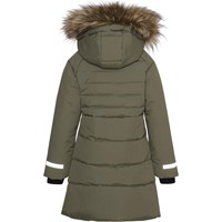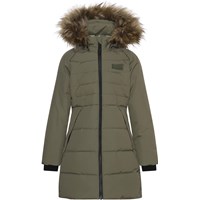 Lange, figurbetonte Winterjacke in Grün mit abnehmbarer Kapuze mit Kunstfellkante (auch abnehmbar), Reißverschluss vorne, seitlichen Eingrifftaschen und Windschutz in den Ärmeln. Futter und Innenstoff der Jacke bestehen aus wiederverwertbarem Polyester. Dieses Produkt hat eine wasserabweisende PFC-freie Imprägnierung (zB enthält kein PFOS, PFOA und dergleichen). Wassersäulendruck: 3.000 mm. Atmungsaktivität: 3.000 g / m2 / 24h