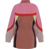 Heather ist eine coole und dennoch feminine Parka-Jacke in Rosa und Pink mit breiten roten, schwarzen und neonfarbenen Streifen. Die Jacke hat eine elastische Taille, die ein- und ausgesnürrt werden kann, und einen Reißverschluss vorne.