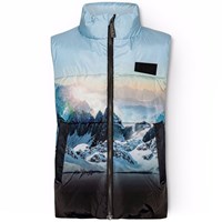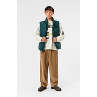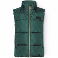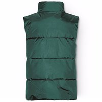 Petroleumgrüne Weste aus recyceltem Polyester für kältere Tage. Die Weste hat einen Stehkragen, einen Frontreißverschluss und große Armlöcher, sodass eine Jacke oder ein dicker Pullover darunter getragen werden können. Sie hat große Reflektoren auf der Rückseite, um die Sichtbarkeit im Straßenverkehr zu erhöhen, sowie ein verstellbares Gummiband am unteren Saum, um den Wind abzuhalten.
