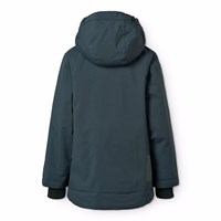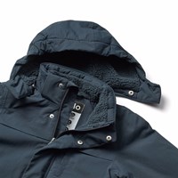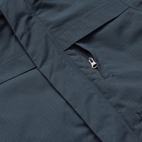 Wind- und wasserdichte dunkelblaue Jacke aus recyceltem Nylon mit praktischem Reißverschluss, hohem Kragen und abnehmbarer gefütterter Kapuze. Die Jacke ist mit Vordertaschen, einer Brusttasche mit Reißverschluss, gerippten Bündchen, die effektiv vor dem Wind schützen, gestaltet. Auf der Rückseite befindet sich ein großer Reflektor, der die Sichtbarkeit im Verkehr erhöht. Die Jacke ist mit weicher, recycelter Polyesterfüllung gefüttert, die für angenehmen Komfort und optimale Wärmeisolierung sorgt.