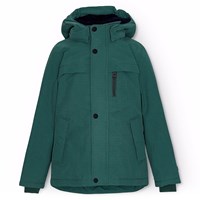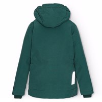 Dunkelgrüne wind- und wasserdichte Winterjacke aus recyceltem Nylon für kalte Winter. Die Jacke hat eine abnehmbare gefütterte Kapuze und einen Reißverschluss mit einer Klappe, die Schnee, Wind und Wasser fernhält. Die Jacke hat einen großen Reflektor auf der Rückseite, um die Sichtbarkeit im Verkehr zu erhöhen. Die Jacke hat gefütterte Vordertaschen und eine Reißverschlusstasche auf der Brust, sowie einen verstellbaren elastischen Bund, der Form und Enge um den Körper bietet. Die Ärmel haben gerippte Bündchen, die effektiv Wind, Schnee und Regen abhalten und dafür sorgen, dass Handschuhe an Ort und Stelle bleiben.