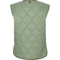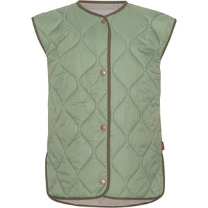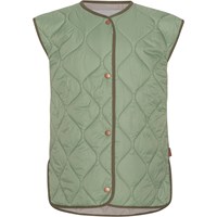 Heisley ist eine grüne Steppweste mit dunkelgrünen Kontrastkanten. Die Weste hat einen Knopfverschluss auf der Vorderseite.