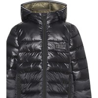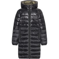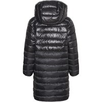 Helin ist ein schwarzer langer Mantel in Schwarz mit abnehmbarer Kapuze. Die Jacke hat einen Reißverschluss und Reißverschlusstaschen auf der Vorderseite. Die Jacke ist mit einer Perlen-Wattierung gefüttert, die ein daunenähnliches Gefühl mit extra Weichheit hat und die Wärme gut hält.