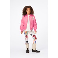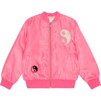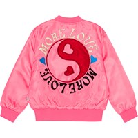 Hellrosa Bomberjacke aus Polyester mit Reißverschluss vorne, Seitentaschen und breiten Rippbündchen an Kragen, Hüfte und Ärmeln. Die Jacke verfügt über eine dekorative Stickerei aus Friedenszeichen mit Herzen auf der Vorderseite sowie ein großes Symbol dieser Art auf der Rückseite, begleitet vom Text „More Love“.