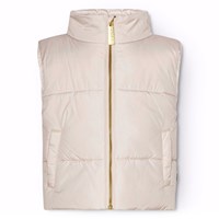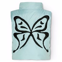 Leicht blaue Steppweste aus recyceltem Polyester mit einem gestickten schwarzen Schmetterling auf der Rückseite. Sie hat einen Stehkragen, einen Frontreißverschluss und große Armöffnungen, die das Tragen einer Jacke oder eines dicken Pullovers darunter ermöglichen. Sie hat Vordertaschen und einen internen Taillen-Elastik, der dazu beiträgt, eine schöne Silhouette zu schaffen. Die wasserabweisende Oberfläche ist frei von PFOS und PFOA.