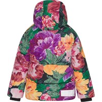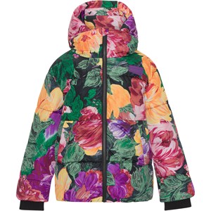 Warme und weiche Steppjacke mit Kapuze. Die Jacke ist Teil von Molos 'Everyday Exploration', die Oberbekleidung für viele Alltagsabenteuer ist und gleichzeitig mit tollen Details oder farbenfrohen Prints auffällt. Natürlich wird auch die Jacke aus verantwortungsvollen und recycelten Materialien hergestellt und erfüllt damit die hohen Ansprüche von Molo an Oberbekleidung. Hier ist Hilo mit großem Blumendruck.
