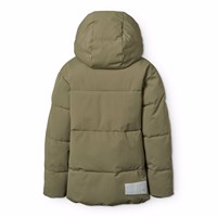 Warme und funktionale dunkelgrüne Jacke aus recyceltem Nylon mit praktischem Reißverschluss, hohem Kragen und abnehmbarer Kapuze. Die Jacke ist mit Vordertaschen, einer Innentasche, gerippten Bündchen und einem verstellbaren Gummizug am Saum versehen, um effektiv vor dem Wind zu schützen. Auf der Rückseite befindet sich ein großer Reflektor, der die Sichtbarkeit im Verkehr erhöht. Die Jacke ist mit weicher, recycelter Polyesterfüllung gefüttert, die für angenehmen Komfort und optimale Wärmeisolierung sorgt.
