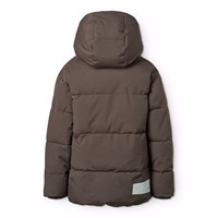 Warmer und funktionaler brauner Mantel aus recyceltem Nylon mit praktischem Reißverschluss, hohem Kragen und abnehmbarer Kapuze. Der Mantel ist mit Vordertaschen, einer Innentasche, gerippten Bündchen und einem verstellbaren Gummizug am Saum für Windschutz ausgestattet. Auf der Rückseite befindet sich ein großer Reflektor zur Erhöhung der Sichtbarkeit im Verkehr. Der Mantel ist mit weicher, recycelter Polyesterfüllung gefüttert für gleichmäßigen Komfort und optimale Wärmeisolierung.