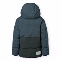 Warme und funktionale blaue Jacke aus recyceltem Nylon mit praktischem Reißverschluss, hohem Kragen und abnehmbarer Kapuze. Die Jacke ist mit Vordertaschen, einer Innentasche, gerippten Bündchen und einem verstellbaren Gummizug am Saum versehen, um effektiv vor dem Wind zu schützen. Auf der Rückseite befindet sich ein großer Reflektor, der die Sichtbarkeit im Verkehr erhöht. Die Jacke ist mit weicher, recycelter Polyesterfüllung gefüttert, die für angenehmen Komfort und optimale Wärmeisolierung sorgt.