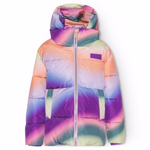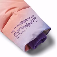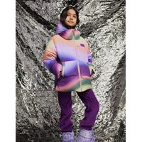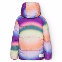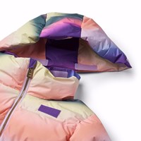 Warme Pufferjacke aus recyceltem Polyester für einen kalten Winter mit einem mehrfarbigen überlaufenden Graffiti-Print. Die Jacke hat eine abnehmbare Kapuze, Seitentaschen und Ärmel mit gerippten Bündchen, die effektiv vor Wind, Schnee und Regen schützen und dafür sorgen, dass Handschuhe an Ort und Stelle bleiben. Die Jacke hat einen großen Reflektor auf der Rückseite, um die Sichtbarkeit im Verkehr zu erhöhen.