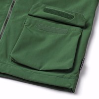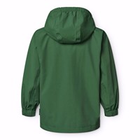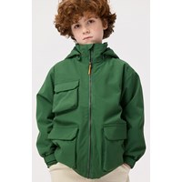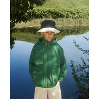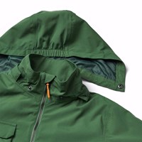Grüne wind- und wasserdichte Jacke aus recyceltem Nylon mit abnehmbarer Kapuze. Die Jacke hat eine normale Passform, Fronttaschen mit Klettverschluss, verstellbaren Klettverschluss an den Handgelenken, wasserdichte Nähte und einen Reißverschluss mit Kinnschutz und innerer Windschutzklappe, um das Wetter draußen zu halten. Die technischen Eigenschaften der Jacke machen sie als Regenmantel geeignet.