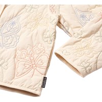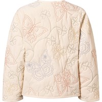 Leichte Steppjacke in einem hellen, cremefarbenen Ton mit wunderschönen gestickten Motiven von Schmetterlingen, Blumen und Kleeblättern in feinen Farben. Die Jacke hat einen verdeckten Reißverschluss mit Druckknopf und ein einfaches, rund geschnittenes Design ohne Kragen. Eine weiche und dekorative Wahl für Frühlings- und Spätsommertage.