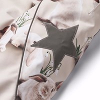 Wind- und wasserdichte Winterjacke aus recyceltem Polyester für einen kalten Winter mit einem Druck süßer Kaninchen zwischen Schneeglöckchen auf grauem Hintergrund. Die Jacke hat eine abnehmbare gefütterte Kapuze mit abnehmbarem Kunstpelzbesatz und zwei Reißverschlüsse auf der Vorderseite mit Kinnschutz, um ein Einklemmen der Haut zu verhindern. Die Reißverschlüsse haben eine innere Sturmklappe, die dazu beiträgt, Schnee, Wind und Wasser fernzuhalten. Die Jacke hat Reflektoren an den Ärmeln, am Rücken und an der Kapuze sowie zwei Sternreflektoren an den Ärmeln, um die Sichtbarkeit im Verkehr zu erhöhen. Die Ärmel haben einen elastischen Rand, der effektiv Wind, Schnee und Regen fernhält und dafür sorgt, dass die Handschuhe an ihrem Platz bleiben. Die Jacke ist mit Fleece und 3M™ Thinsulate™ gefüttert, was dem Kind aufgrund seines geringen Gewichts eine größere Beweglichkeit bietet.