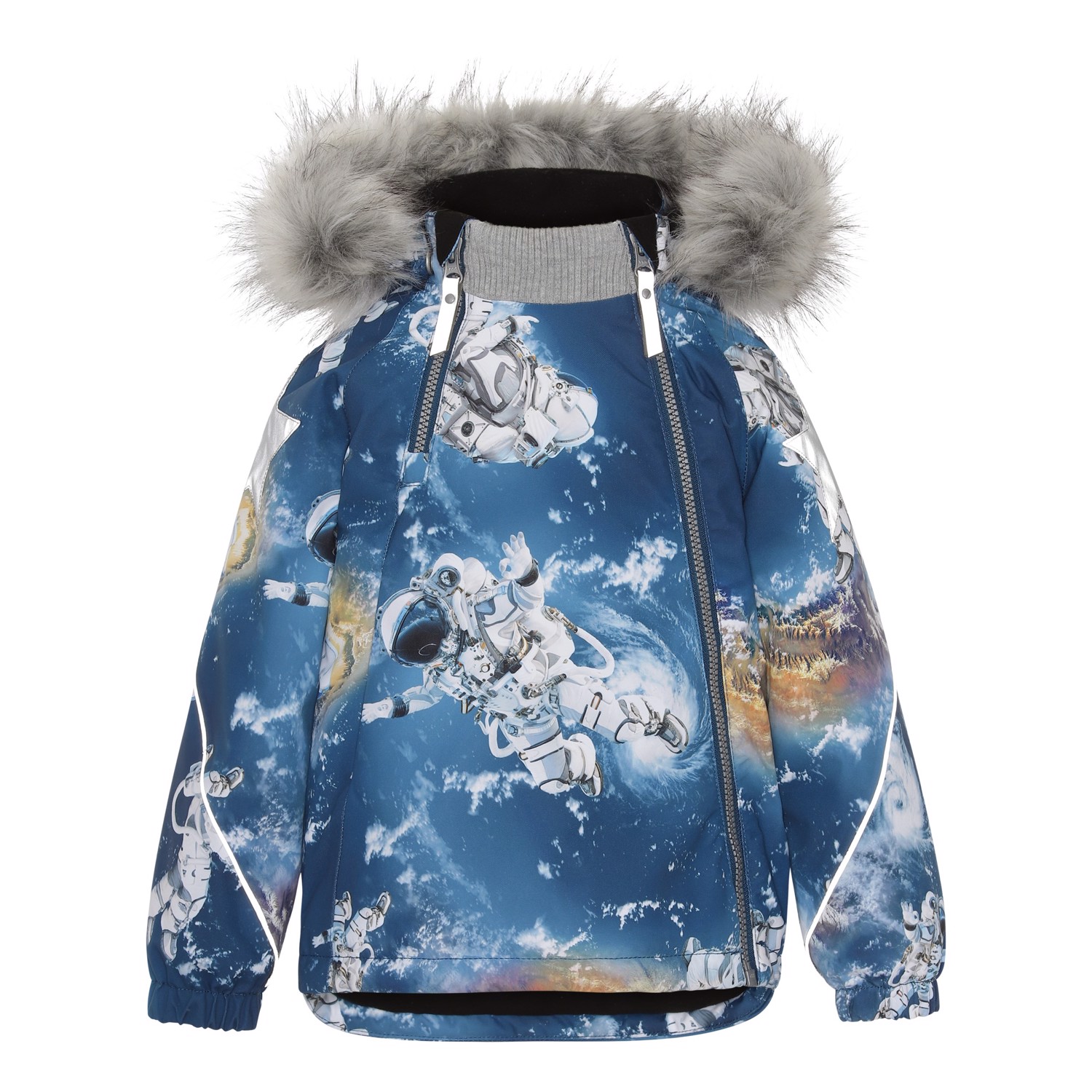 Hopla Fur ist eine funktionelle und wasserdichte Winterjacke in Blau mit Astronauten-Print.Hopla Fur ist aufgrund seiner unglaublich hohen Atmungsaktivität und Isolierung perfekt für die extrem kalten und gewöhnlichen Winter. Die hohe Atmungsaktivität hilft, die Körpertemperatur zu regulieren und sorgt dafür, dass Ihrem Kind nicht zu kalt oder zu heiß wird. An wärmeren Wintertagen kann das Kind daher mit dünnen Schichten darunter auskommen und an Tagen mit heftigen zweistelligen Minusgraden können Sie mit einer zusätzlichen Schicht darunter ergänzen. Wenn Sie ein stillsitzendes Kind haben, ist Hopla Fur auch eine offensichtliche Wahl. Die Jacke hat eine abnehmbare Kapuze mit Kunstpelzkragen (der auch entfernt werden kann), schräge Reißverschlüsse auf der Vorderseite, Ripp am Hals, Gummizug an den Ärmelenden und Molo's bekannten reflektierenden Stern an beiden Oberarmen und am Saum der Jacke hinten. Außerdem hat die Jacke an exponierten Stellen hochwertiges Fleece und getapte Nähte. Das Außenmaterial besteht zu 45% aus recyceltem Polyester, das 3M™ Thinsulate™ Futter zu 78% aus recyceltem Polyester und die Innenseite zu 100 % aus recyceltem Polyester. Dieses Produkt hat eine wasserabweisende PFC-freie Imprägnierung (zB enthält kein PFOS, PFOA und dergleichen). Der Wassersäulendruck und die Atmungsaktivität wurden weiter verbessert und liegen nun bei bis zu 15.000 mm Wassersäulendruck und einer Atmungsaktivität von 15.000 g/m2/24h.