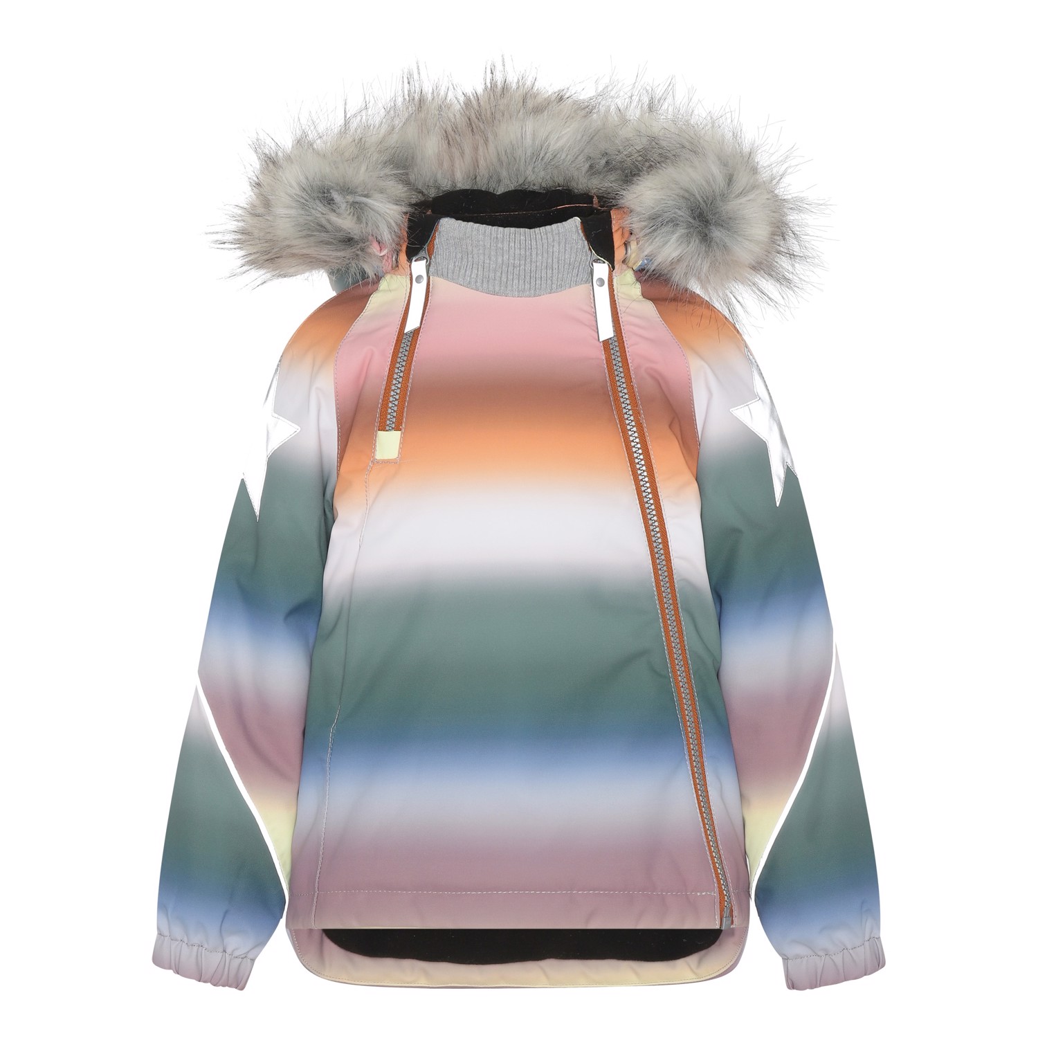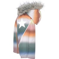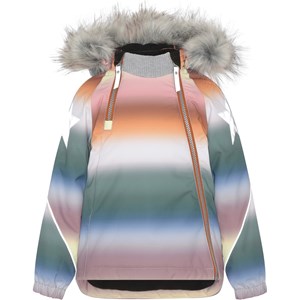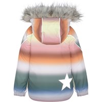 Hopla Fur ist eine funktionelle und wasserdichte Winterjacke mit pastellfarbenem Regenbogen-Print. Hopla Fur ist aufgrund seiner unglaublich hohen Atmungsaktivität und Isolierung perfekt für die extrem kalten und gewöhnlichen Winter. Die hohe Atmungsaktivität hilft, die Körpertemperatur zu regulieren und sorgt dafür, dass Ihrem Kind nicht zu kalt oder zu heiß wird. An wärmeren Wintertagen kann das Kind daher mit dünnen Schichten darunter auskommen und an Tagen mit heftigen zweistelligen Minusgraden können Sie mit einer zusätzlichen Schicht darunter ergänzen. Wenn Sie ein stillsitzendes Kind haben, ist Hopla Fur auch eine offensichtliche Wahl.Die Jacke hat eine abnehmbare Kapuze mit Kunstpelzkragen (der auch entfernt werden kann), schräge Reißverschlüsse auf der Vorderseite, Ripp am Hals, Gummizug an den Ärmelenden und Molo's bekannten reflektierenden Stern an beiden Oberarmen und am Saum der Jacke hinten. Außerdem hat die Jacke an exponierten Stellen hochwertiges Fleece und getapte Nähte. Das Außenmaterial besteht zu 45% aus recyceltem Polyester, das 3M™ Thinsulate™ Futter zu 78% aus recyceltem Polyester und die Innenseite zu 100 % aus recyceltem Polyester. Dieses Produkt hat eine wasserabweisende PFC-freie Imprägnierung (zB enthält kein PFOS, PFOA und dergleichen). Der Wassersäulendruck und die Atmungsaktivität wurden weiter verbessert und liegen nun bei bis zu 15.000 mm Wassersäulendruck und einer Atmungsaktivität von 15.000 g/m2/24h.