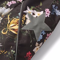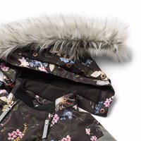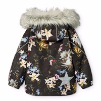 Schwarze wind- und wasserdichte Winterjacke aus recyceltem Polyester mit einem Druck bunter Blumen. Die Jacke hat eine abnehmbare gefütterte Kapuze mit abnehmbarem Kunstpelzbesatz, zwei Reißverschlüsse vorne mit einer Innenschutzklappe und einen gerippten Kinnschutz, um ein Einklemmen der Haut zu verhindern. Die Jacke hat reflektierendes Band an den Ärmeln, am Rücken und an der Kapuze sowie zwei reflektierende Sterne, um die Sichtbarkeit im Verkehr zu gewährleisten. Die Ärmel haben einen elastischen Bund, der den Wind, Schnee und Regen draußen hält und die Handschuhe an Ort und Stelle hält. Darüber hinaus ist die Jacke mit recyceltem Polyesterfleece, 3M™ Thinsulate™, gefüttert, das hilft, die Wärme zu speichern.