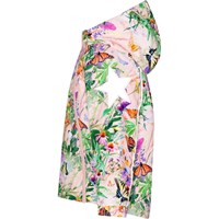 Leichte rosa Anorak-ähnliche Jacke aus teilweise recyceltem Polyester mit einem Allover-Print aus Wildblumen und flatternden Schmetterlingen. Die Jacke hat einen Stehkragen mit weichem Rippstrick, eine abnehmbare Kapuze, diagonale Reißverschlüsse mit Kinnschutz, elastische Armausschnitte und einen innenliegenden verstellbaren Gummizug an der Hüfte. Auf der Rückseite ist die Jacke mit reflektierenden Streifen sowie großen sternförmigen Reflektoren sowohl am Rücken als auch an den Ärmeln ausgestattet, was für eine gute Sichtbarkeit im Straßenverkehr sorgt.