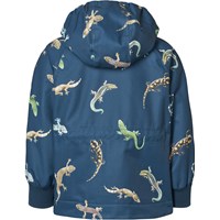 Dunkelblaue Jacke aus recyceltem Polyester, die vor Wind und Wasser schützt. Die Jacke hat einen bunten Druck von Geckos, eine abnehmbare Kapuze, Taschen, einen Reißverschluss mit Kinnschutz und einen breiten gerippten Rand an den Handgelenken. Die Taille kann intern für eine gute Passform angepasst werden.
