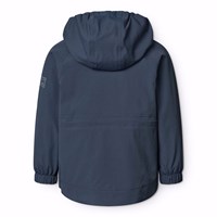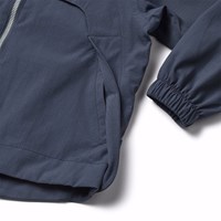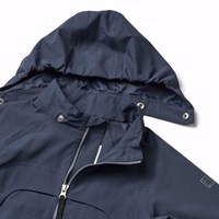 Dunkelblaue wind- und wasserdichte Jacke aus recyceltem Polyester. Die Jacke verfügt über eine abnehmbare Kapuze, Taschen mit Windschutzklappen, einen Reißverschluss mit Kinnschutz und innerer Windschutzklappe sowie elastische Bündchen, die effektiv den Wind abhalten. Im Inneren hat sie ein verstellbares Gummiband an der Taille, um die Silhouette und Passform der Jacke anzupassen. Die technischen Merkmale der Jacke machen sie als Regenmantel geeignet.