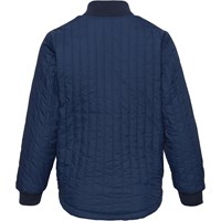 Hudson ist eine dunkelblaue leichte gesteppte Jacke. Die Jacke hat einen Reißverschluss vorne, eine zusätzliche Länge hinten und eine gerippte Kante am Kragen, am Ärmelende und unten.