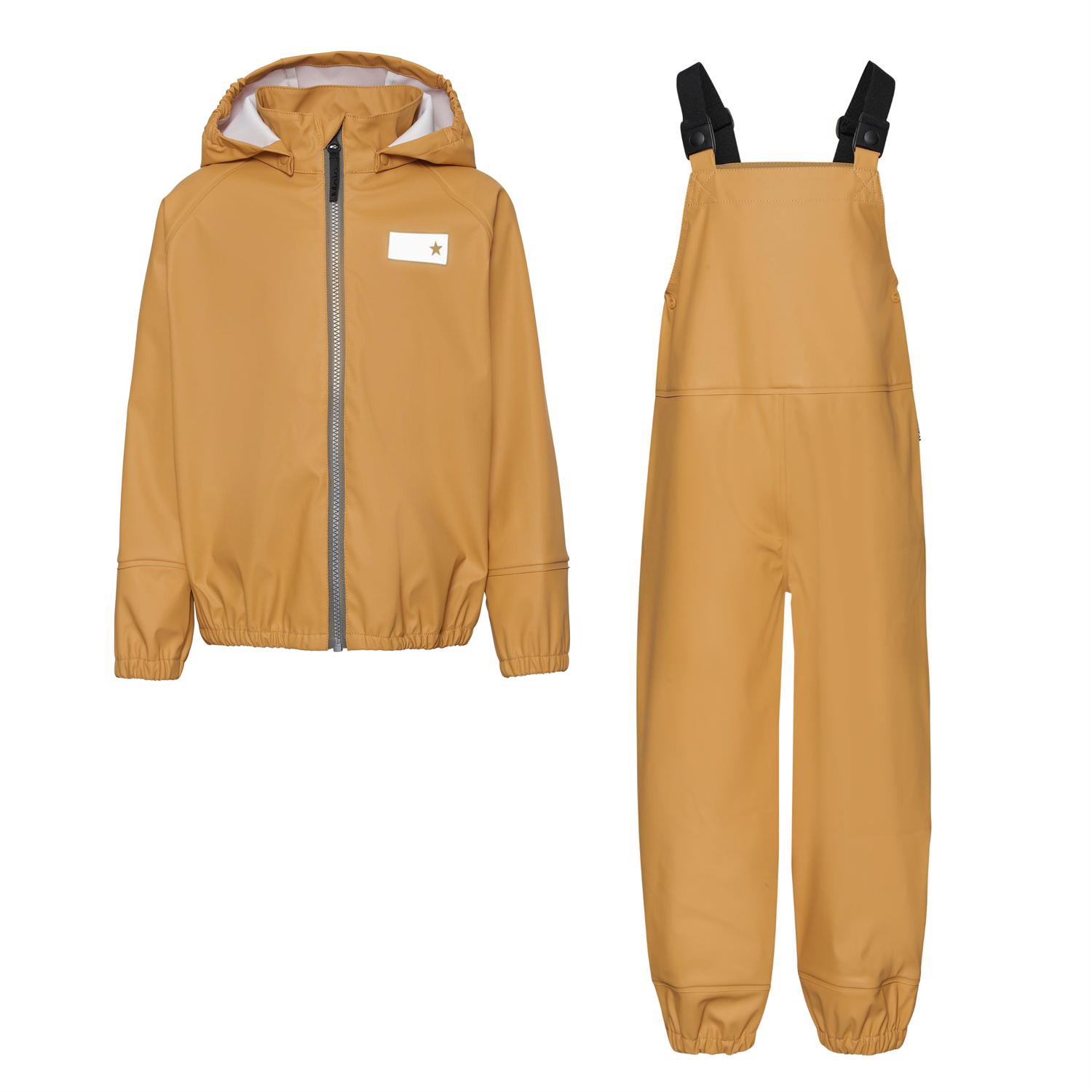 Wade ist ein Regen-Set, das aus einer Regenjacke und einem Regenoverall in einer schönen Honigfarbe besteht. Die Regenjacke hat eine abnehmbare Kapuze und einen Reißverschluss vorne. Die Regenhose hat verstellbare Hosenträger und einen elastischen Beinverschluss. Sowohl die Regenjacke als auch die Hose haben Molos bekannten reflektierenden Stern auf der Rückseite. Dieses Produkt hat eine wasserabweisende PFC-freie Imprägnierung (enthält zB kein PFOS, PFOA und dergleichen). Wassersäulendruck: 8.000 mm. Atmungsaktivität: 8.000 g / m2 / 24h.
