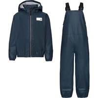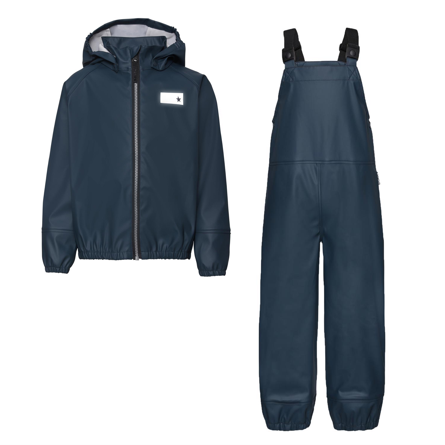 Wade ist ein dunkelblaues Regen-Set, das aus einer Regenjacke und einem Regenoverall besteht. Die Regenjacke hat eine abnehmbare Kapuze und einen Reißverschluss vorne. Die Regenhose hat verstellbare Hosenträger und einen elastischen Beinverschluss. Sowohl die Regenjacke als auch die Hose haben Molos bekannten reflektierenden Stern auf der Rückseite. Dieses Produkt hat eine wasserabweisende PFC-freie Imprägnierung (enthält zB kein PFOS, PFOA und dergleichen). Wassersäulendruck: 8.000 mm. Atmungsaktivität: 8.000 g / m2 / 24h.