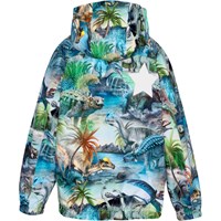 Regenjacke mit Allover-Print verschiedener Dinosaurier in Blau- und Grüntönen. Die Jacke besteht aus einem leichten und atmungsaktiven Material, das auch bei hoher Aktivität verhindert, dass sich Kondenswasser und Feuchtigkeit an der Innenseite ansammelt. Die Jacke verfügt über eine abnehmbare Kapuze, zwei Vordertaschen, Gummizüge an den Armlöchern und am Saum sowie einen abgedeckten Reißverschluss, der vor Wind und Regen schützt. Auf der Rückseite verfügt die Jacke über einen großen Sternreflektor, der die Sichtbarkeit im Straßenverkehr erhöht. Alle Nähte sind versiegelt, um das Eindringen von Wasser zu verhindern. Wassersäulendruck: 5.000 mm. Atmungsaktivität: 5.000 g/m2/24h.